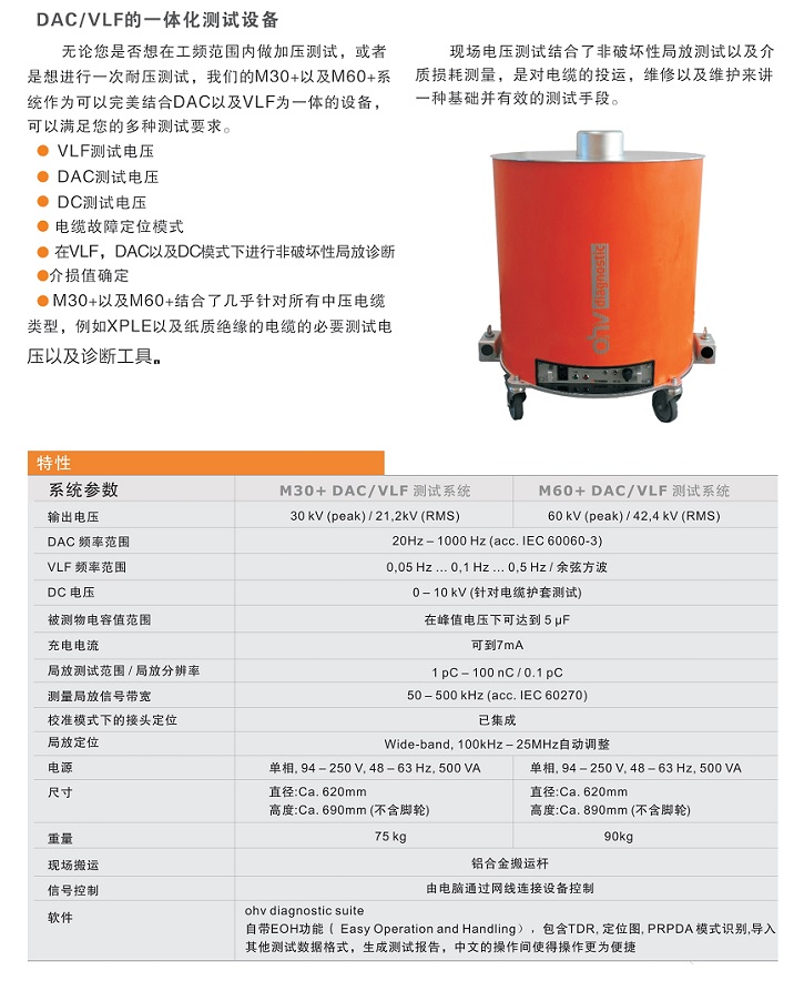 DAC/VLF M30+电缆电压故障定位测试仪 DAC/VLF M60+电缆电压故障定位测试仪 DAC M60电缆振荡波测试系统 用途广泛的 DAC 中压电缆振荡波测试系统 可进行耐压测试, 局放分析以及局放定位 DAC M30  M40   M60 阻尼交流测试系统  DAC M30、M40 和 M60 高级阻尼交流 (DAC) 电缆测试系统分别集成了高达 30 kV 还存在用于高压传输类电缆的模型(DAC H...